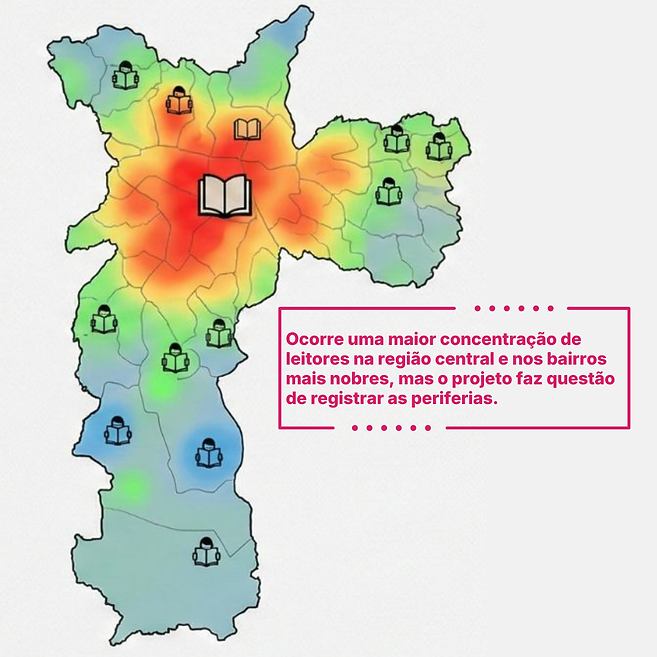 No projeto, o mapa cultural da cidade ganha contornos curiosos: é no centro pulsante e nos bairros de alto padrão que a leitura parece encontrar seus redutos mais frequentes. Ainda assim, há um gesto de resistência e de justiça, em registrar também as mãos que seguram livros na periferia, onde cada página virada carrega um significado diferente.